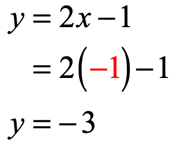 The next obvious step is to figure out the value of y for each x in the table. To do that, we will use the given equation of the line because it is the formula that gives us direct information how to arrive for the value of y when given an x value. We are going to use the formula three times since we have three values of x.